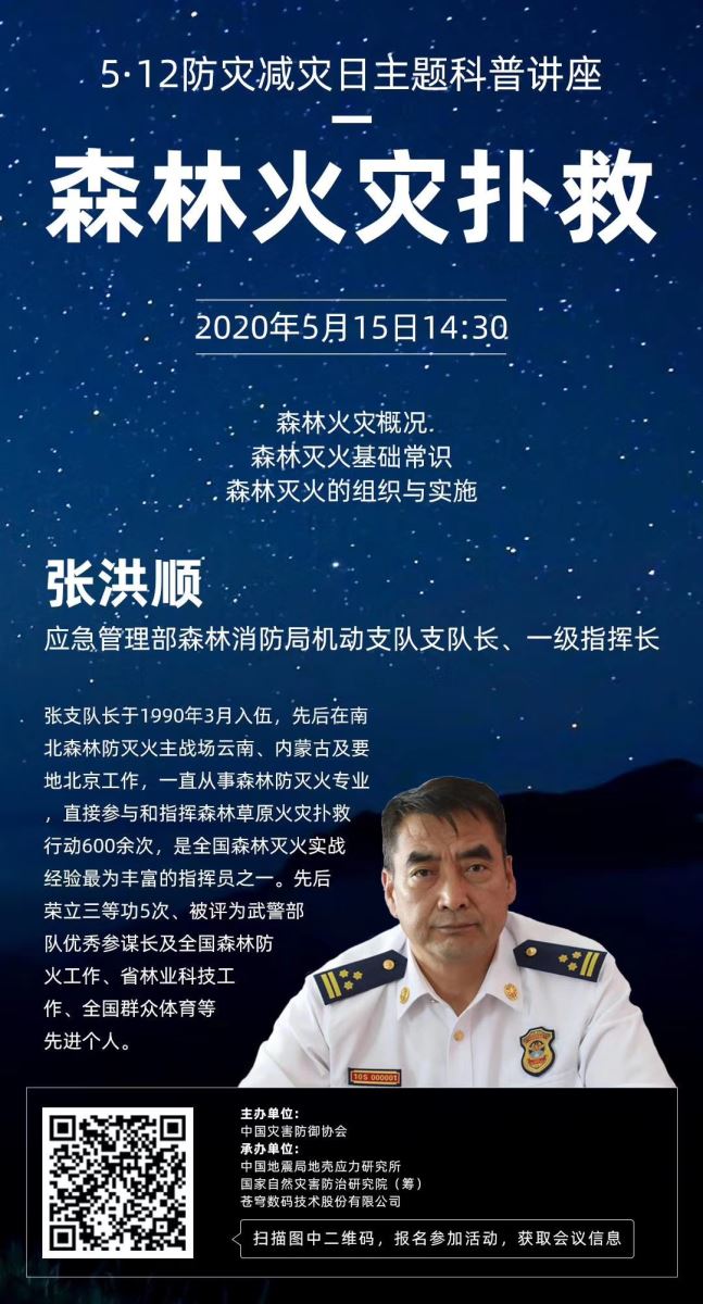 為廣泛宣傳和普及災(zāi)害知識(shí)、防災(zāi)減災(zāi)知識(shí)等,由中國(guó)災(zāi)害防御協(xié)會(huì)主辦,蒼穹數(shù)碼技術(shù)股份有限公司等單位承辦的5.12防災(zāi)減災(zāi)日主題科普講座之森林火災(zāi)撲救將于5.15日下午兩點(diǎn)半線上舉行。主講嘉賓:應(yīng)急管理部森林消防局機(jī)動(dòng)支隊(duì)支隊(duì)長(zhǎng)、一級(jí)指揮長(zhǎng)張洪順。張支隊(duì)長(zhǎng)于1990年3月入伍,先后在南北森林防滅火主戰(zhàn)場(chǎng)云南、內(nèi)蒙古及要地北京工作,一直從事森林防滅火專業(yè),直接參與和指揮森林草原火災(zāi)撲救行動(dòng)600余次,是全國(guó)森林滅火實(shí)戰(zhàn)經(jīng)驗(yàn)最為豐富的指揮員之一。先后榮立三等功5次、被評(píng)為武警部隊(duì)優(yōu)秀參謀長(zhǎng)及全國(guó)森林防火工作、省林業(yè)科技工作、全國(guó)群眾體育等先進(jìn)個(gè)人。屆時(shí),他將為我們分享森林火災(zāi)概況、森林滅火基礎(chǔ)常識(shí)、森林滅火的組織與實(shí)施。