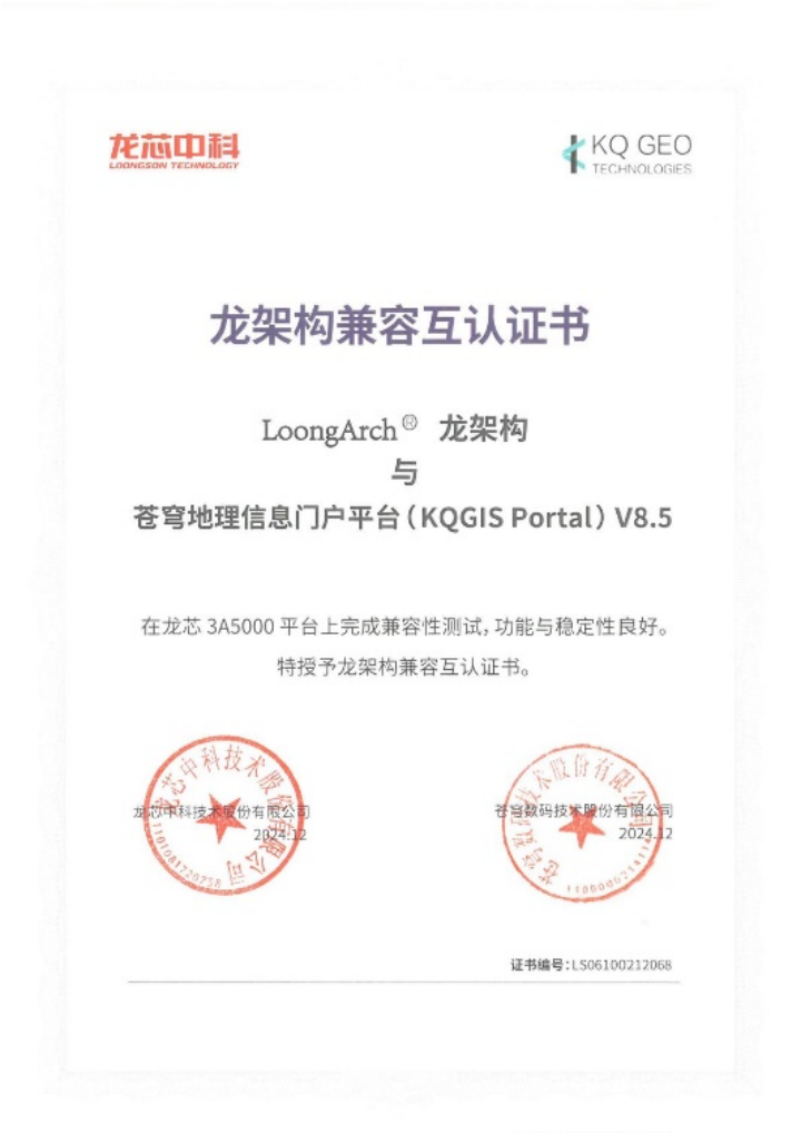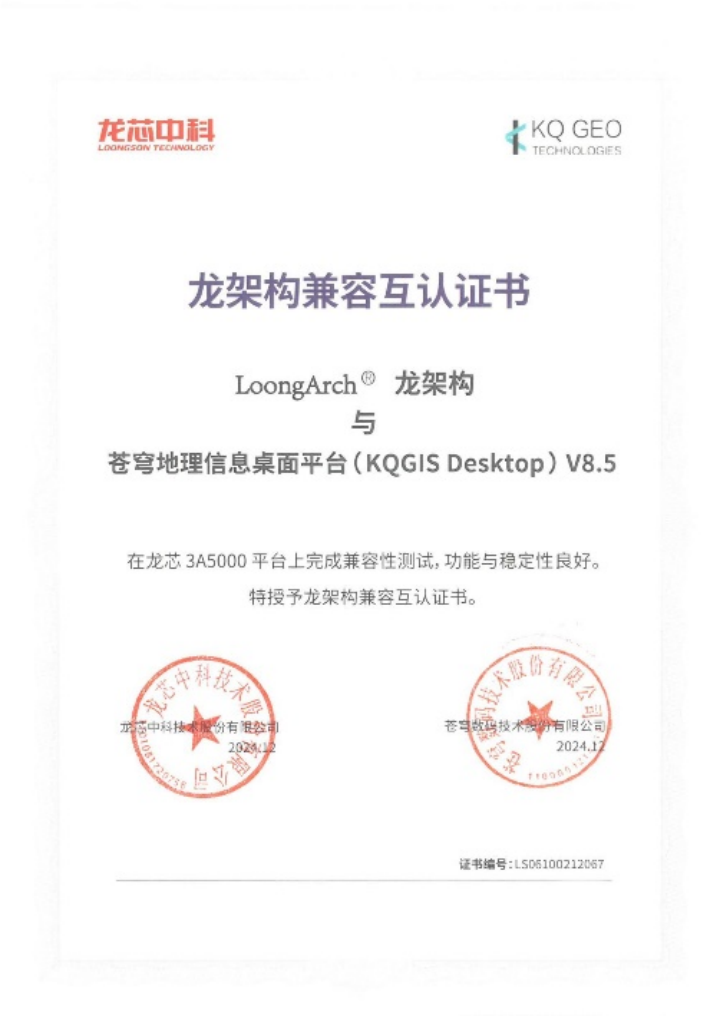 蒼穹數(shù)碼和龍芯中科的產(chǎn)品適配認(rèn)證,是雙方共同開(kāi)展的一項(xiàng)覆蓋產(chǎn)品功能完整性、性能穩(wěn)定性以及安全性等多個(gè)關(guān)鍵維度的測(cè)試活動(dòng)。經(jīng)過(guò)嚴(yán)謹(jǐn)和細(xì)致的測(cè)試,證明KQGIS在龍芯環(huán)境上運(yùn)行流暢,性能卓越,能夠完全滿(mǎn)足用戶(hù)對(duì)于關(guān)鍵性應(yīng)用的高標(biāo)準(zhǔn)需求。本次適配認(rèn)證也意味著蒼穹數(shù)碼在國(guó)產(chǎn)環(huán)境廣泛兼容性上又得到了進(jìn)一步提升,能夠?yàn)橛脩?hù)提供更加優(yōu)秀的GIS產(chǎn)品。