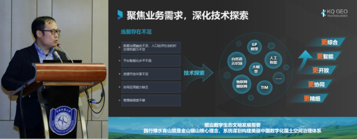 學(xué)術(shù)研討為業(yè)內(nèi)專家學(xué)者搭建了一個共商自然資源和國土空間數(shù)字化治理技術(shù)研究路徑的開放平臺,也為推動自然資源領(lǐng)域信息化進(jìn)程、加強(qiáng)跨學(xué)科合作奠定了基礎(chǔ)。蒼穹數(shù)碼技術(shù)股份有限公司董事長徐文中、軟件事業(yè)部總經(jīng)理李慈武參加研討并作主題報告,將當(dāng)前在自然資源領(lǐng)域應(yīng)用探索的前瞻性信息技術(shù)進(jìn)行了交流分享,提出“更綜合的數(shù)據(jù)治理體系、更智能的平臺支撐能力、更開放的資源共享應(yīng)用、更協(xié)同的業(yè)務(wù)橫縱流轉(zhuǎn)、更精細(xì)的數(shù)據(jù)管理應(yīng)用”數(shù)字化轉(zhuǎn)型技術(shù)之路,同時以實踐案例闡述了GP模型、AI大模型、自然語言識別等技術(shù)融合業(yè)務(wù)應(yīng)用的研究進(jìn)展與后續(xù)探索方向。