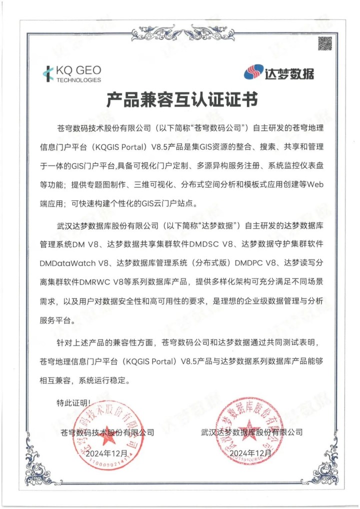 數(shù)據(jù)安全始終是客戶最關心的問題之一。KQGIS和DM都是數(shù)據(jù)的重要載體,通過蒼穹自主研發(fā)的GIS系統(tǒng)與國產化達夢數(shù)據(jù)庫完成兼容認證,實現(xiàn)雙方平臺的深度融合,蒼穹數(shù)碼能打造出更加高效、安全可控的數(shù)字底座,讓客戶的業(yè)務系統(tǒng)具備更高的可用性和可拓展能力,助力企業(yè)進行供應鏈數(shù)字化轉型,邁入數(shù)智化發(fā)展的新階段。