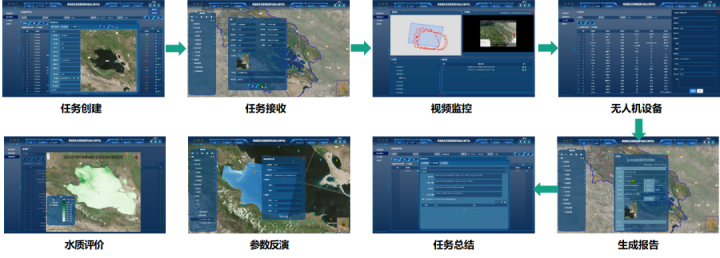 集作業(yè)任務(wù)管理、數(shù)據(jù)管理、生態(tài)環(huán)境綜合分析、輔助決策、系統(tǒng)管理多功能于一體。采用無(wú)人機(jī)搭載高光譜載荷,結(jié)合地面光譜及水質(zhì)參數(shù)采集監(jiān)測(cè)手段獲取水質(zhì)狀況數(shù)據(jù),對(duì)湖區(qū)進(jìn)行水環(huán)境質(zhì)量、水生生物、水體低質(zhì)、輻射環(huán)境、水質(zhì)遙感監(jiān)測(cè)以及周邊生態(tài)系統(tǒng)等精細(xì)化管理、統(tǒng)計(jì)、計(jì)算。