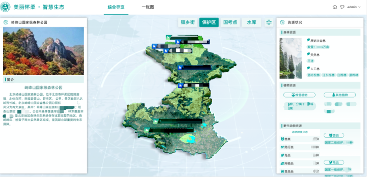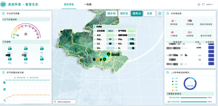 打開平臺的生態(tài)環(huán)境"一張圖",一幅會呼吸的數(shù)字畫卷徐徐展開。依托Unity3D技術(shù)構(gòu)建的全域三維沙盤,將鎮(zhèn)鄉(xiāng)街、保護(hù)區(qū)、國考點、水庫四大要素深度融合,山川走勢、水體脈絡(luò)、城鎮(zhèn)分布盡在指尖流轉(zhuǎn)。大氣與地表水實時數(shù)據(jù)在界面兩側(cè)動態(tài)呈現(xiàn),重點水體、噪聲動態(tài)分區(qū)、生物多樣性分布等核心要素?zé)o縫嵌入,織就"水源涵養(yǎng)—聲環(huán)境保護(hù)—物種棲息"的全域天網(wǎng)。從此,懷柔的每一寸生態(tài)家底,都在數(shù)字世界中清晰可觸。