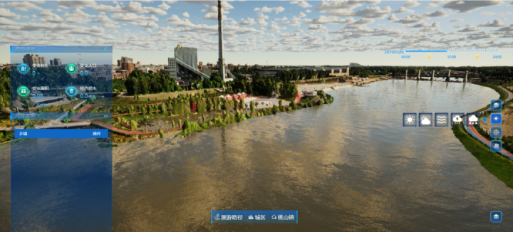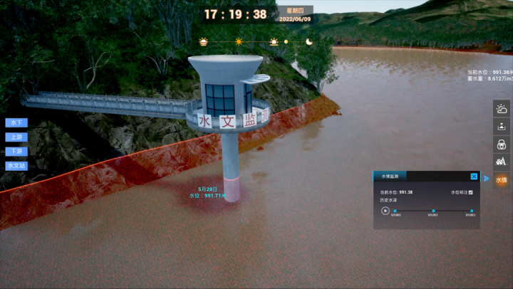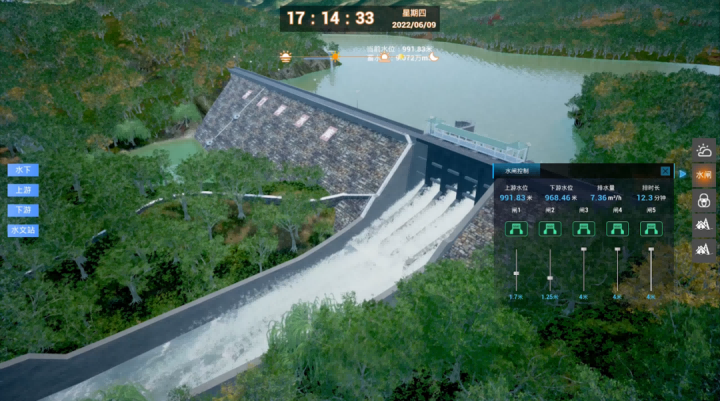 采用動(dòng)態(tài)渲染技術(shù),模擬仿真閘門啟閉、泄水、流量變化過程。與閘門自動(dòng)控制系統(tǒng)對接,遠(yuǎn)程控制閘門啟閉,達(dá)到水利工程運(yùn)行的虛實(shí)交互。