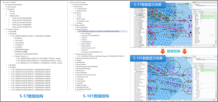 此外,系統(tǒng)還提供了不同格式之間的數(shù)據(jù)轉(zhuǎn)換工具,可一鍵實(shí)現(xiàn)S57轉(zhuǎn)S101、測深數(shù)據(jù)轉(zhuǎn)S102,并實(shí)時(shí)可視化呈現(xiàn),為S100系列產(chǎn)品的支持提供基礎(chǔ)。