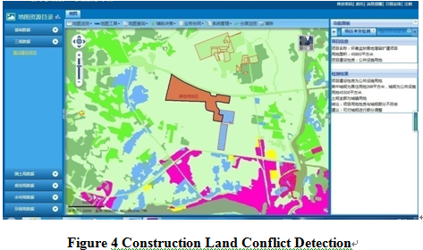 The functions include conflict detection regulation management of “Multi-regulation” data; intelligent conflict detection of “Multi-regulation” data, control line detection, mining resources exploiting time sequence detection etc. The subsystem can timely discover land use conflict and put forward preliminary solutions.